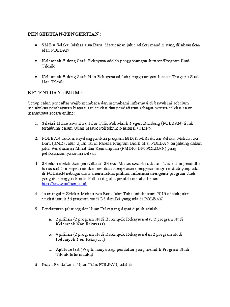 Materi Smb Polban / Pendaftaran Mahasiswa Polban Bandung Ta 2021 2022 Pendaftaran Mahasiswa - Materi yang diujikan pada seleksi penerimaan mahasiswa baru politeknik negeri bandung (polban) adalah sebagai berikut